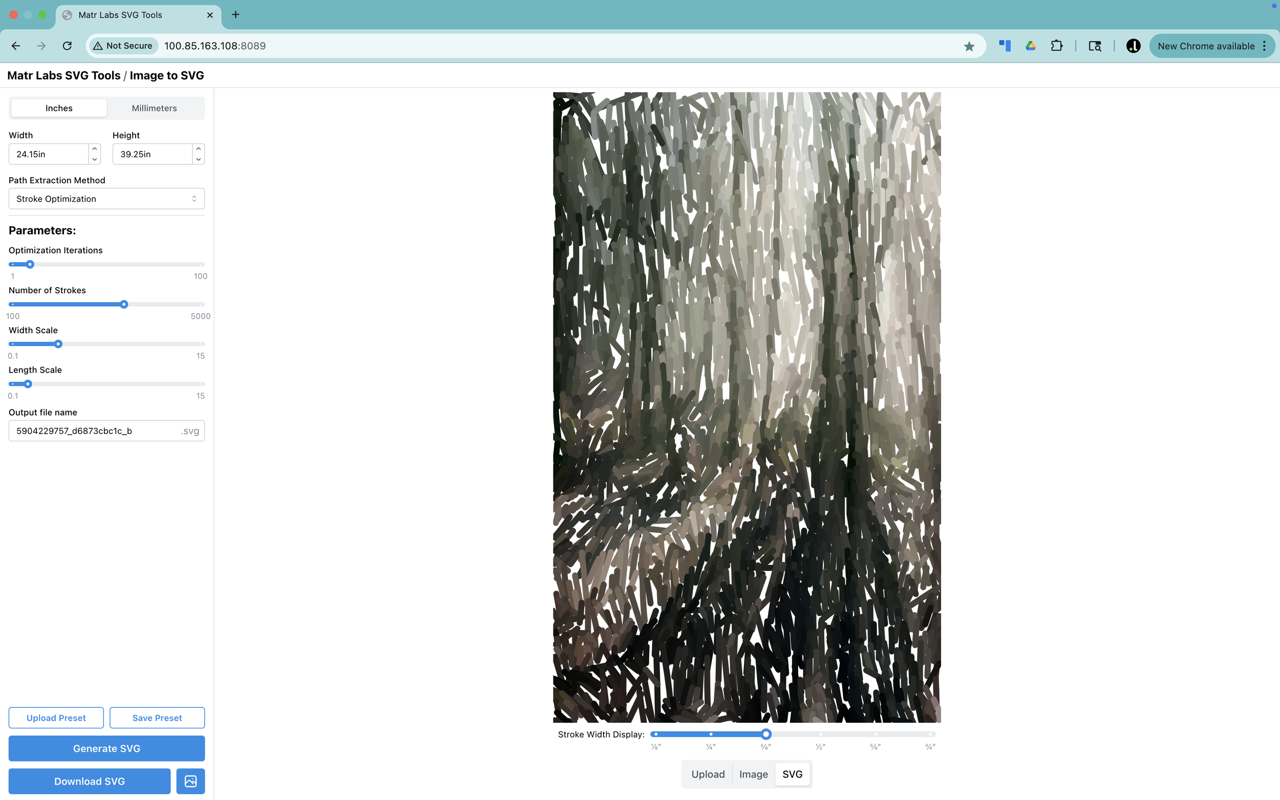Software prototype (above) that lead to the future development of a custom CAD/CAM tool for creating unique brushstrokes from uploaded images (below)